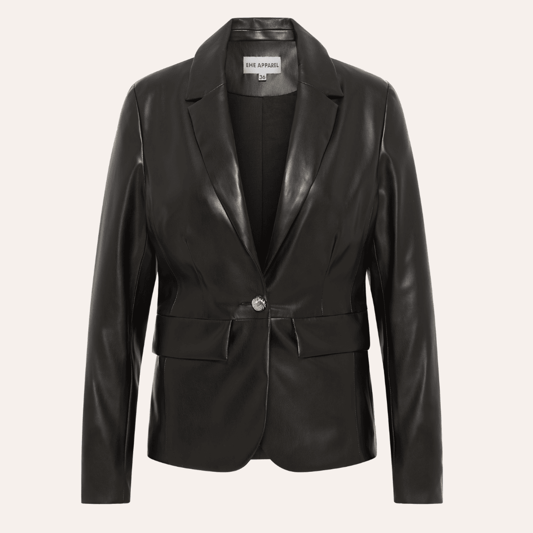 One-button vegan leather blazer with gold-colored metal buttons. (without functioning pocket)