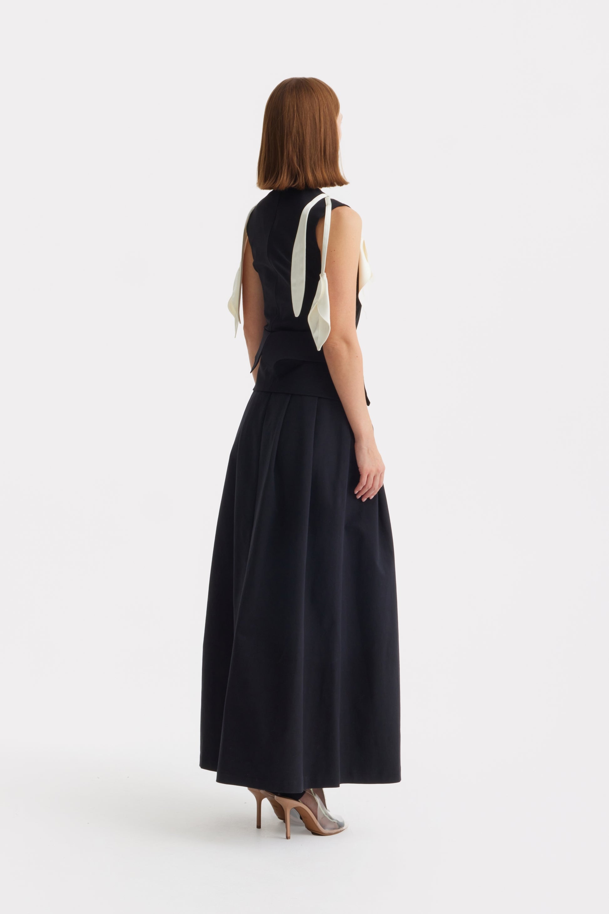 This sleeveless black top crafted from a suiting-weight viscose blend offers a sophisticated tailored fit with subtle stretch for comfort. Its minimalist front is accented by draped ivory side panels that flow gracefully from the shoulders, resembling abstract petals. The concealed back zipper ensures a smooth silhouette, balancing architectural precision with fluid elegance. Ideal for pairing with trousers or skirts, this piece delivers refined, statement-making style for the discerning wardrobe.