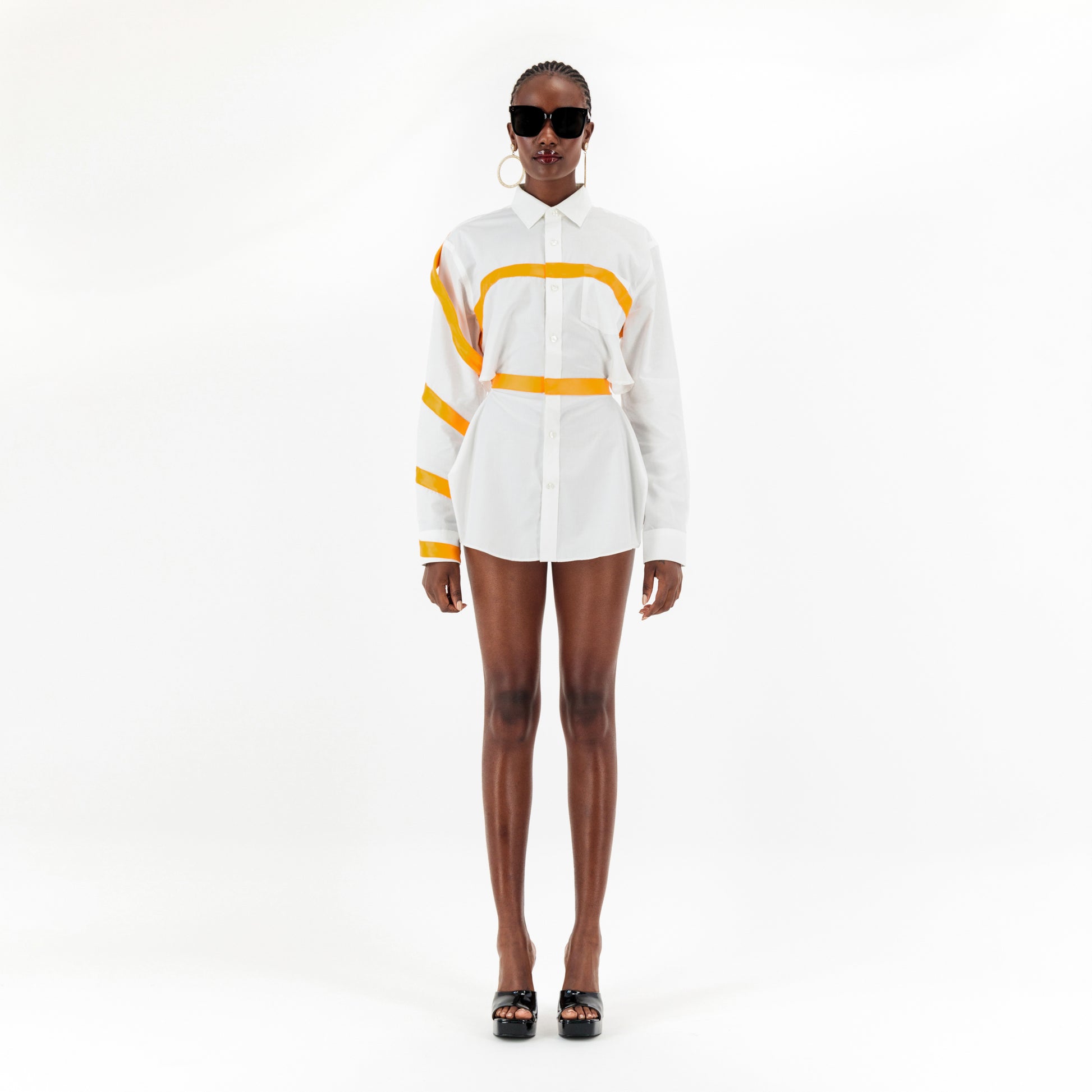 Elevate your wardrobe with this sophisticated long-sleeve shirt dress, expertly tailored with a fitted waist for a refined silhouette. The crisp white base is punctuated by striking orange faux leather spiral accents that traverse the chest, sleeves, and back, creating visual interest and contemporary edge. Designed with precision details including a pointed collar, front button closure, functional front pocket, and buttoned cuffs, this piece transitions seamlessly from professional settings to elevated casual occasions. The tapered construction ensures a polished fit that flatters while maintaining comfort throughout the day.